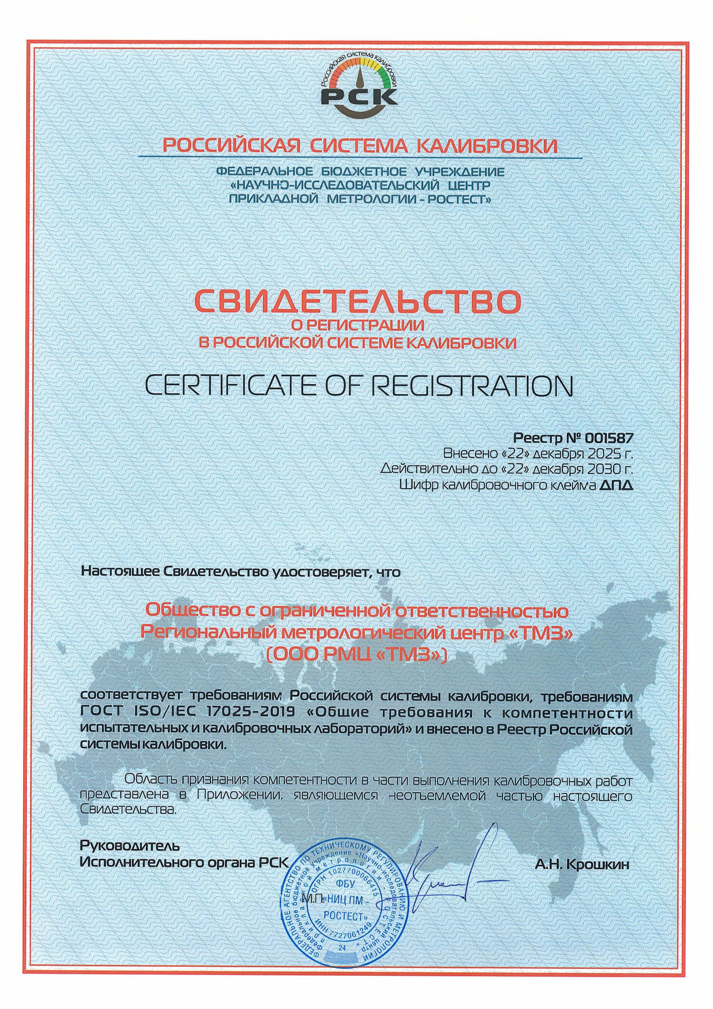 По результатам калибровки средств измерений ООО РМЦ «ТМЗ» выдает сертификат о калибровке (документ, удостоверяющий факт и результаты калибровки средства измерений)